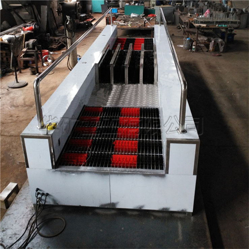 礦用洗靴機主要由洗靴系統(tǒng)、支撐部件、傳動系統(tǒng)、電控系統(tǒng)、連接部件、人體行走扶手等構(gòu)成,安置在井口或副井井口洗靴池處。升井人員走至洗靴機時,人體紅外線傳感器便會指令自動打開傳動系統(tǒng)和噴淋系統(tǒng),礦工行走或任意停留在刷洗靴機中間,就可自動把膠靴底、靴面、靴幫、靴尖、靴跟刷得干干凈凈,徹底解決了員工升井后還要用手刷靴,費時費力還刷不干凈的問題,減輕了員工勞動強度,保持了井口衛(wèi)生,減輕了粉塵污染,又能節(jié)約用水,是礦井標(biāo)準化建設(shè)的可靠產(chǎn)品。