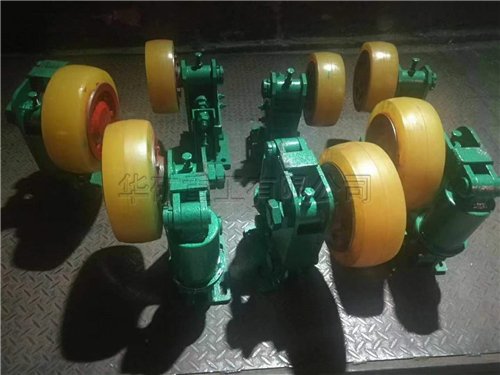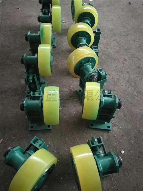滾輪罐耳用于礦山提升容器的導向緩沖,本產品采用先進的密封技術,適應淋水、煤塵等惡劣環境。輪頭安裝采用三鎖緊結構,避免掉輪頭事故的發生。滾輪采用四氫呋喃-環氧丙烷共聚醚型聚氨酯澆注,具有高彈性、耐撕裂、抗水性、抗油性的優點。滾輪磨損補償調節采用左、右旋螺桿,調節迅速便捷。機座、擺架采用優質鋼板焊接成型,體積小、重量輕,安裝輕便。滾輪罐耳主要由輪軸、支架、緩沖裝置、底座等組成。