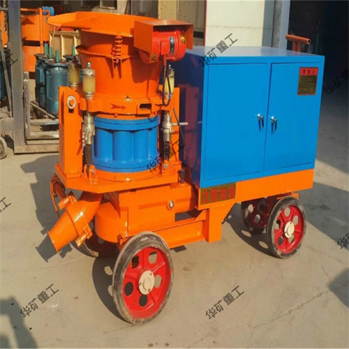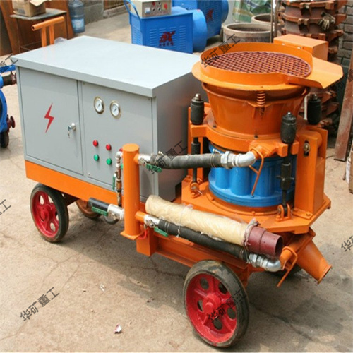 干式噴漿機簡稱干噴機,是將一定比例的水泥、砂子及小石子均勻攪拌后,借助壓縮空氣為動力,使拌合料連續地沿著輸送管路被吹送到噴射嘴處。與來自壓力水箱的壓力水混合成為半濕的混凝土,以每秒80~100米的速度噴射到工作面上,使之達到襯砌的效果。噴射時,噴嘴一般距離工作面1米左右,一邊噴射,一邊慢慢畫圈移位。