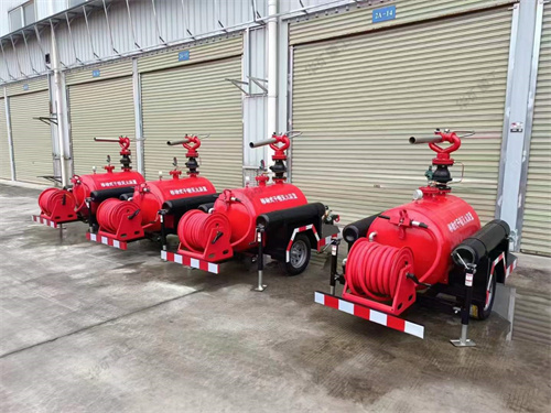 移動干粉滅火裝置,以高壓氮氣為動力,將儲罐內(nèi)干粉滅火劑通過干粉炮或干粉槍噴向保護對象,由于干粉的比重較大,在氣流的作用下能覆蓋到火上不致被氣流沖散。干粉在火焰的作用下破壞了原有的結晶,以新的化學物質(zhì)中斷了燃燒的鏈式反應,窒息火焰,同時干粉在分解過程中大量吸熱,使著火區(qū)域溫度迅速下降,從而控制撲滅火災。