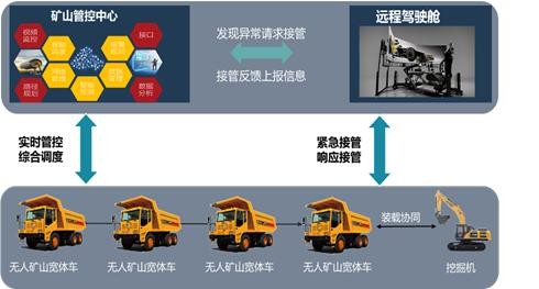 在大唐集團寶利主要驗證5G和無人駕駛的功能以及可靠性,參與作業生產的系統包括遠程駕駛、自動駕駛、機群管控,三個系統在不同階段參與車輛行駛作業和裝卸作業生產。遠程駕駛車端配備5G終端、高清攝像頭、車載控制器,當作業生產需要遠程駕駛系統時,主動向機群管控中心提出接管請求,機群管控中心通過5G網絡實現遠程控制。自動駕駛系統通過V2X、多種傳感器信息融合計算和決策實現超視距融合感知,結合車輛自身的定位和地圖信息進行決策規劃,進行自主作業。機群管控中心將路側感知的信息融合分析構建虛擬環境模型,預測系統運行狀況;另外實現露天礦山挖掘機設備、運輸設備的協同生產場景進行實時監控、調度作業和生產指揮。